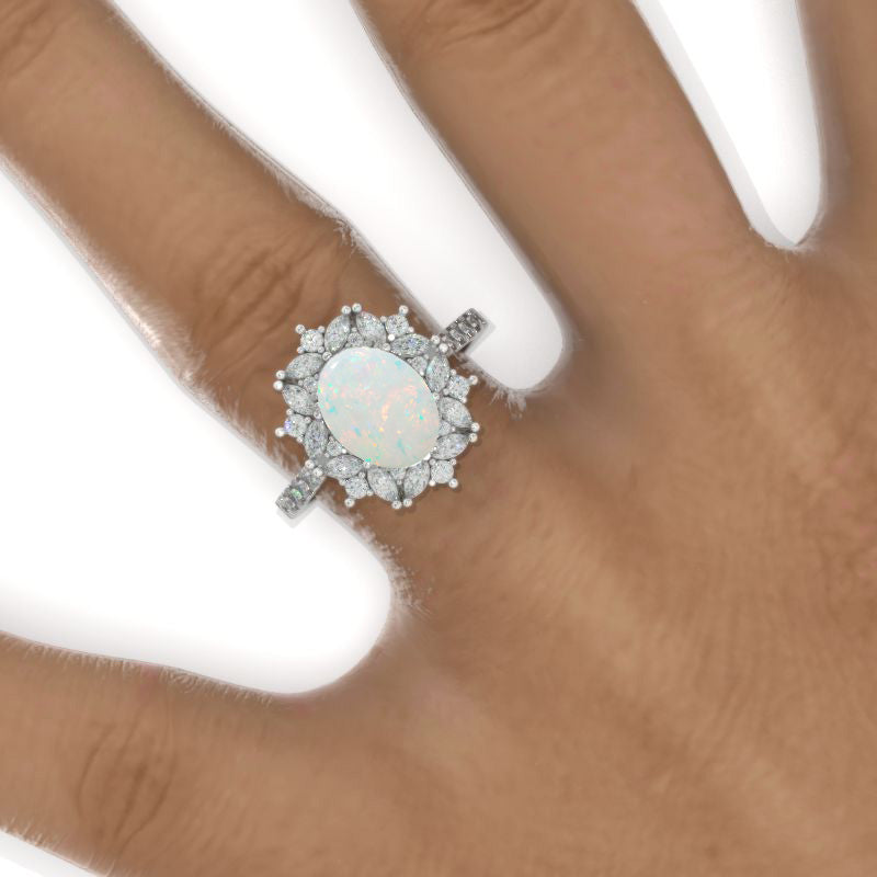 2 Carat Oval Genuine Natural White Opal Halo Vintage 14K White Gold Engagement Ring
