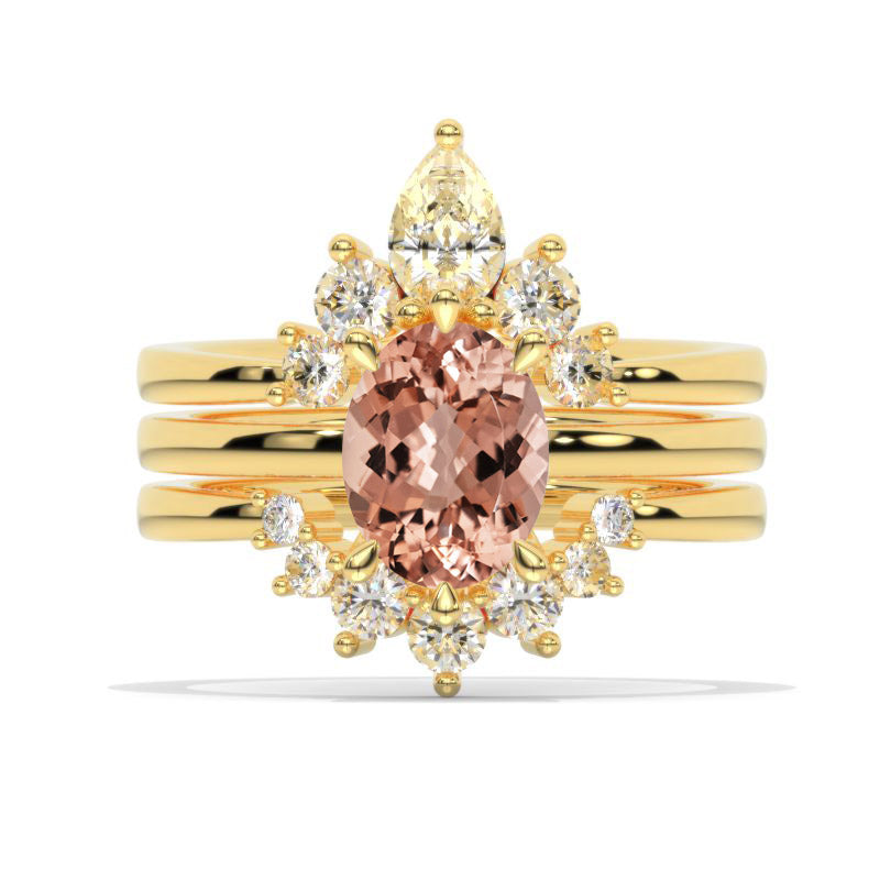 2 Carat Oval Genuine Peach Morganite Engagement 14K White Gold Three Fairy Tail Ring Eternity Ring Set Model 1023