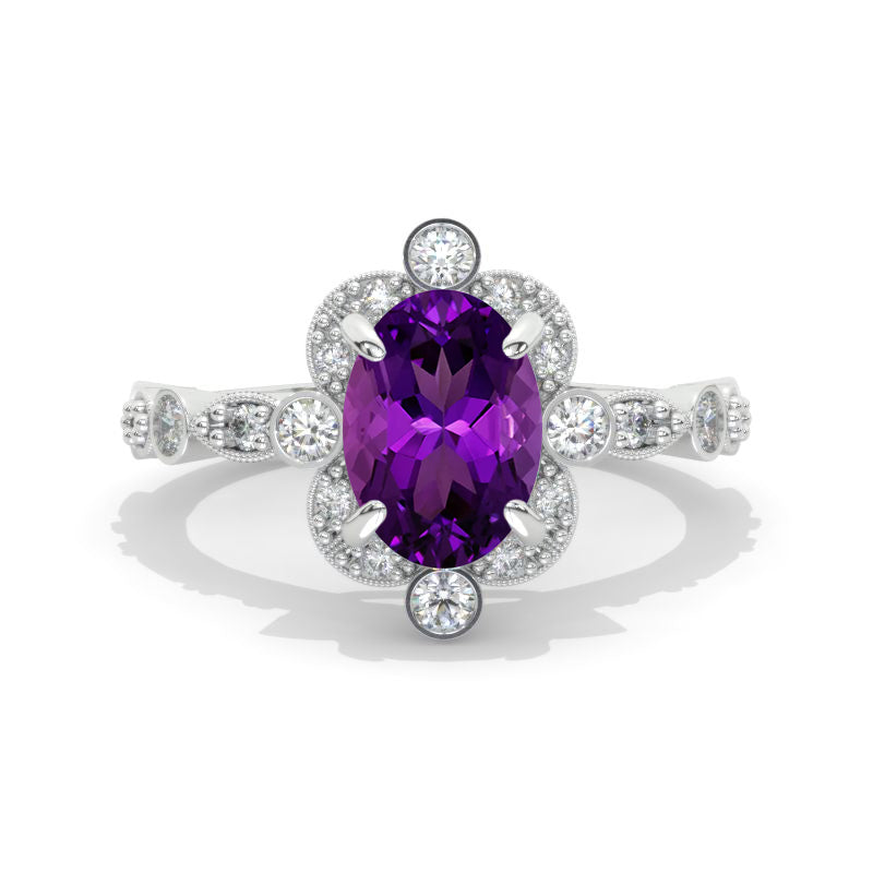 The default design option features 10x7mm Oval Cut Genuine Natural Amethyst- AAAA Grade Stone, VG-Cut, Ex-Polish, VG-Symmetry,Ā Set with Colorless Moissanite Accent stonesĀ in 14K White Gold Engagement Ring.Ā