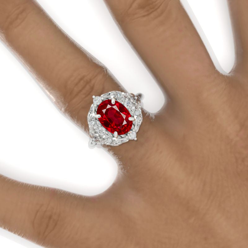 2 Carat Oval Ruby Floral Leaves Setting White Gold Engagement Ring