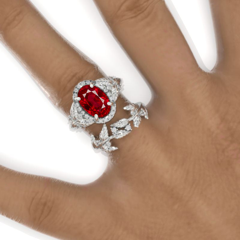 2 Carat Oval Ruby Halo Floral Engagement Ring Eternity Ring Set