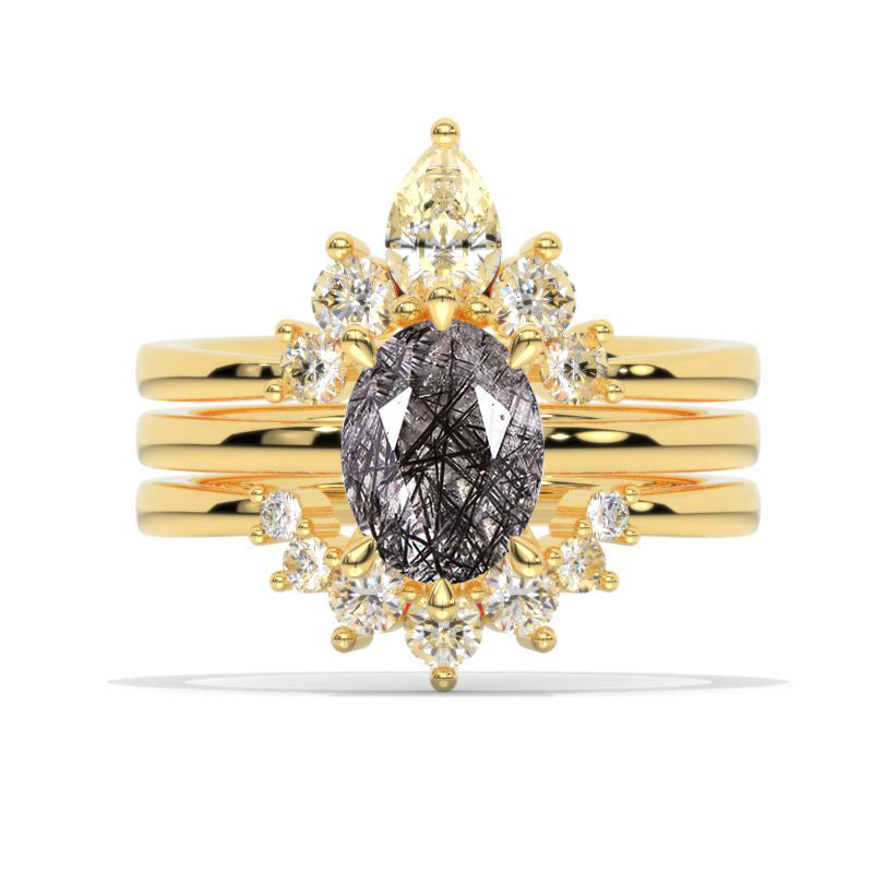 2 Carat Oval Rutilated Quartz Engagement 14K White Gold Three Fairy Tail Ring Eternity Ring Set