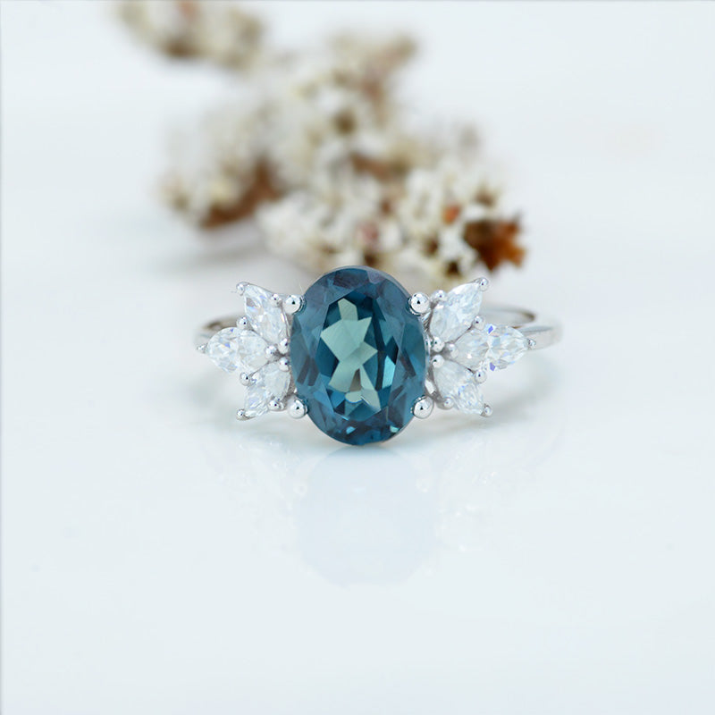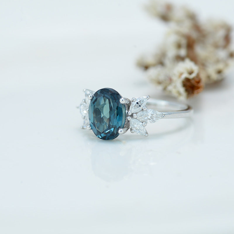 Engagement : 2 Carat Teal Sapphire Ethically Lab-Grown Oval 9x7 mm , VVS1-Clarity, VG-Cut, Ex-Polish, VG-Symmetry Center Stone with  Colorless 0.6 CTW Moissanite