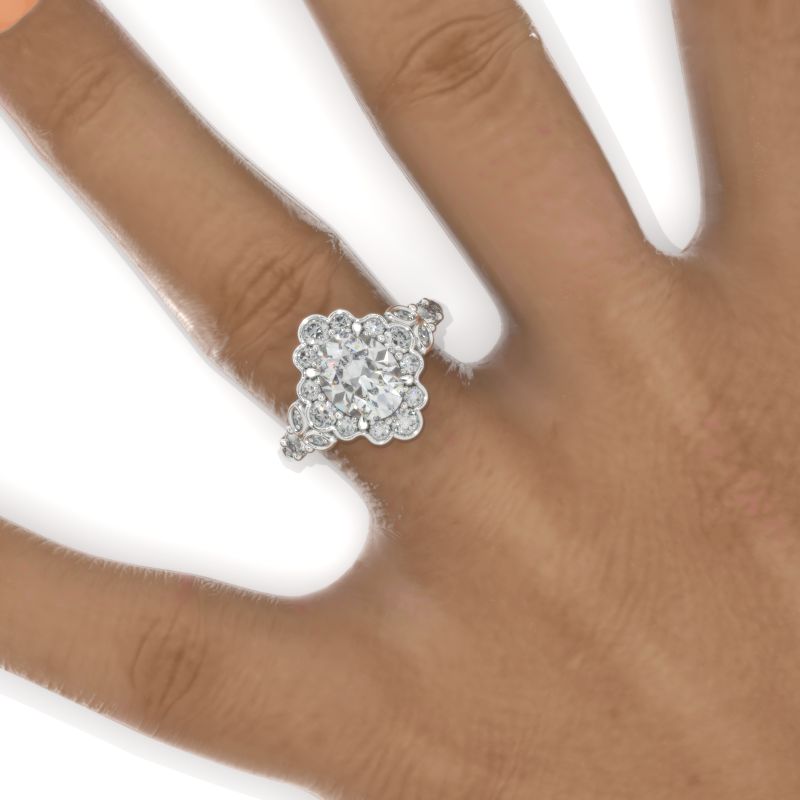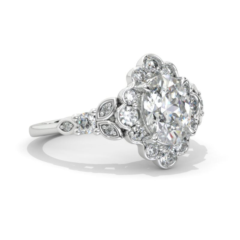 The default design option features 9x7mm Oval Cut LAB-Grown Diamond Center and Accent Stones, D-Colorless, VVS1-Clarity, VG-Cut, Ex-Polish, VG-Symmetry
