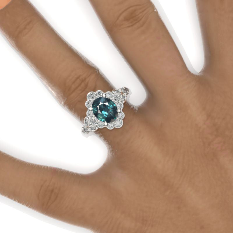 2 Carat Oval Vintage Teal Sapphire Ring, Luxury Prong Setting Oval Cut Halo Engagement Ring 2ct Carat Oval Victorian Ring