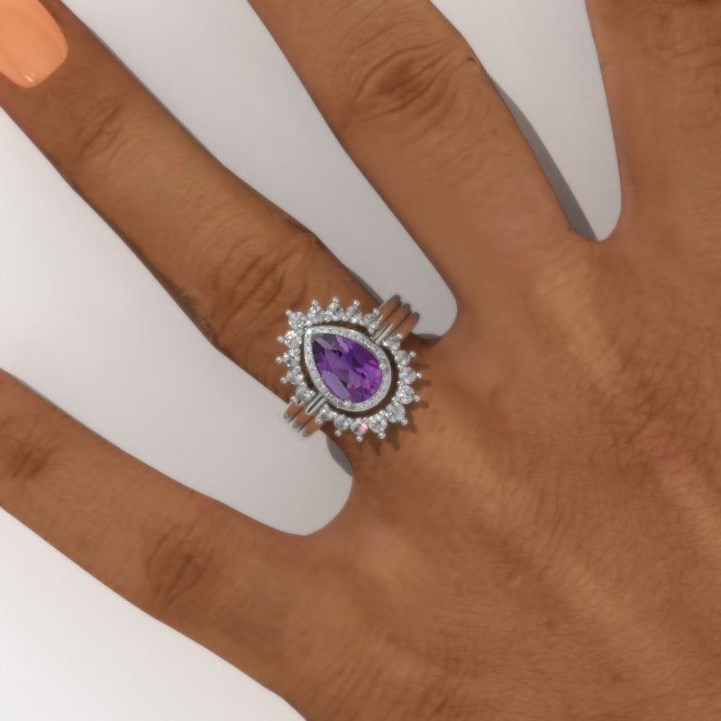 2 Carat Pear Natural Amethyst Halo Engagement 14K White Gold Ring Eternity Ring Set