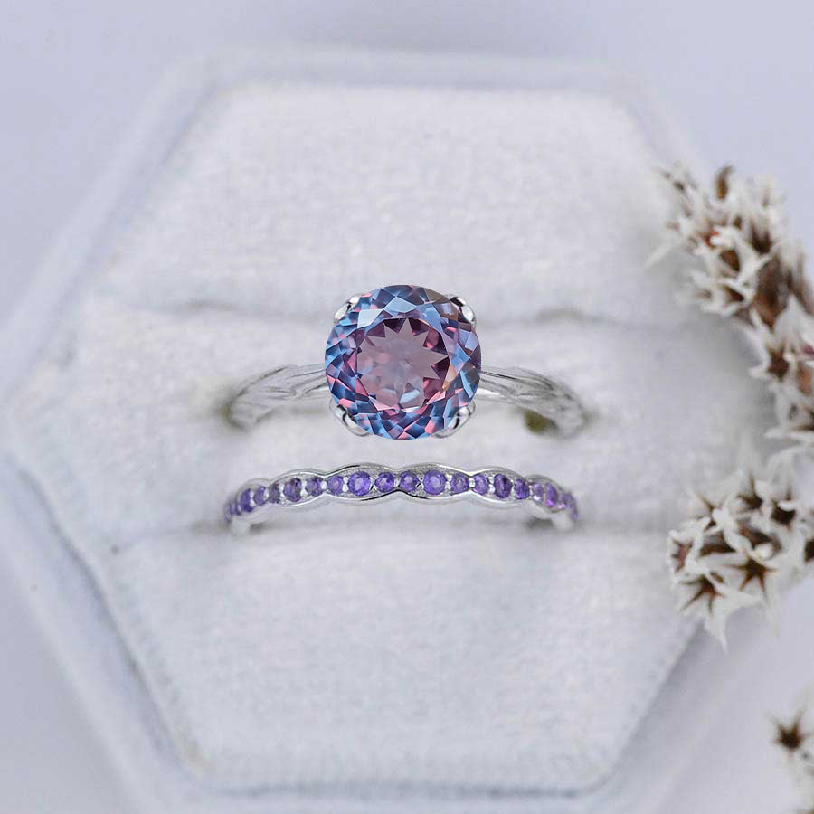The default design option features 8mm Round Portuguese Cut Ethically Lab-Grown Alexandrite, VG-Cut, Ex-Polish, VG-Symmetry set with Amethyst Accent Stones