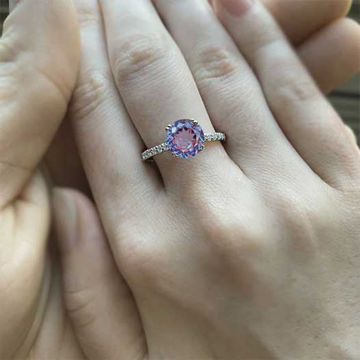On the image featured 2 carat round Portuguese Cut Ethically Lab-Grown Alexandrite 8 mm round brilliant cut