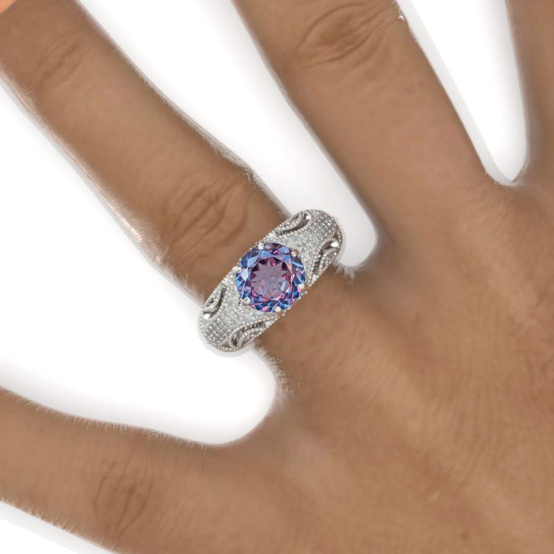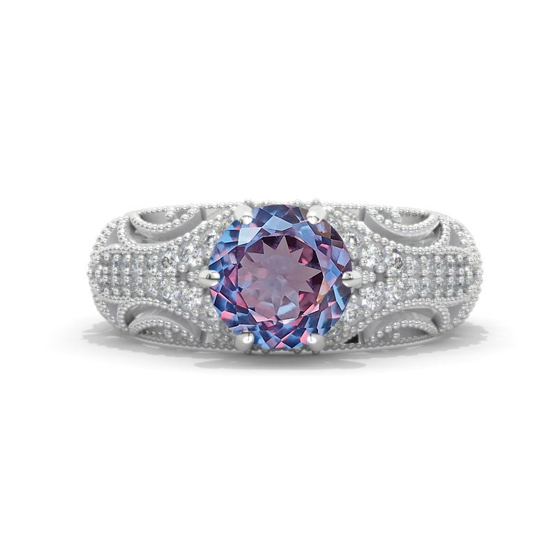 2 Carat Portuguese Cut Alexandrite Round Victorian Style Lace Shank Engagement Ring. Victorian 14K White Gold Ring