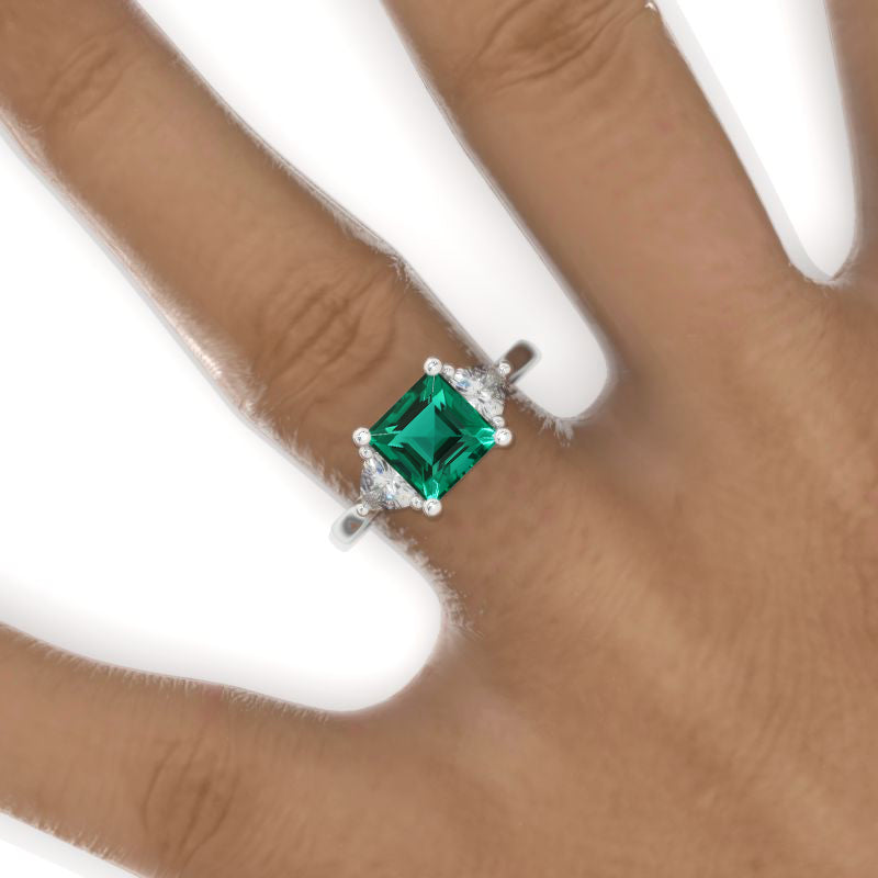 7x7m Princess Cut Ethically Lab-Grown Emerald, VG-Cut, Ex-Polish, VG-Symmetry Center Stone and Two Trillion-(D-Colorless,Ā VVS1 clarity) Moissanite Accent Stones in 14K White Gold Ring.Ā
