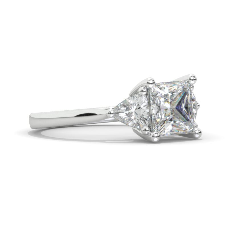 7x7m Princess Cut LAB-Grown Diamond D-Colorless, VVS1-Clarity, VG-Cut, Ex-Polish, VG-Symmetry Center Stone and Two Trillion-(D-Colorless,Ā VVS1 clarity) LAB-Grown Diamond Accent Stones in 14K White Gold Ring.Ā