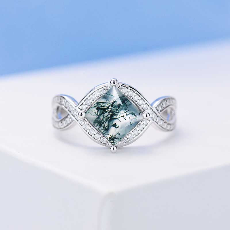2 Carat Princess Cut Genuine Moss Agate Stone 14K White Gold Ring Mode - Giliarto