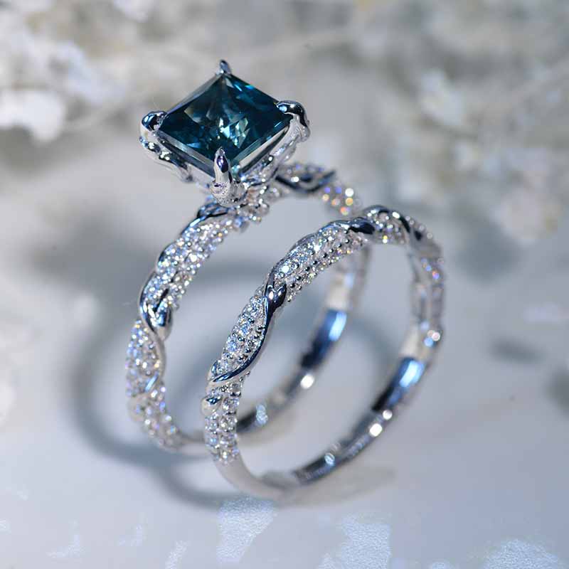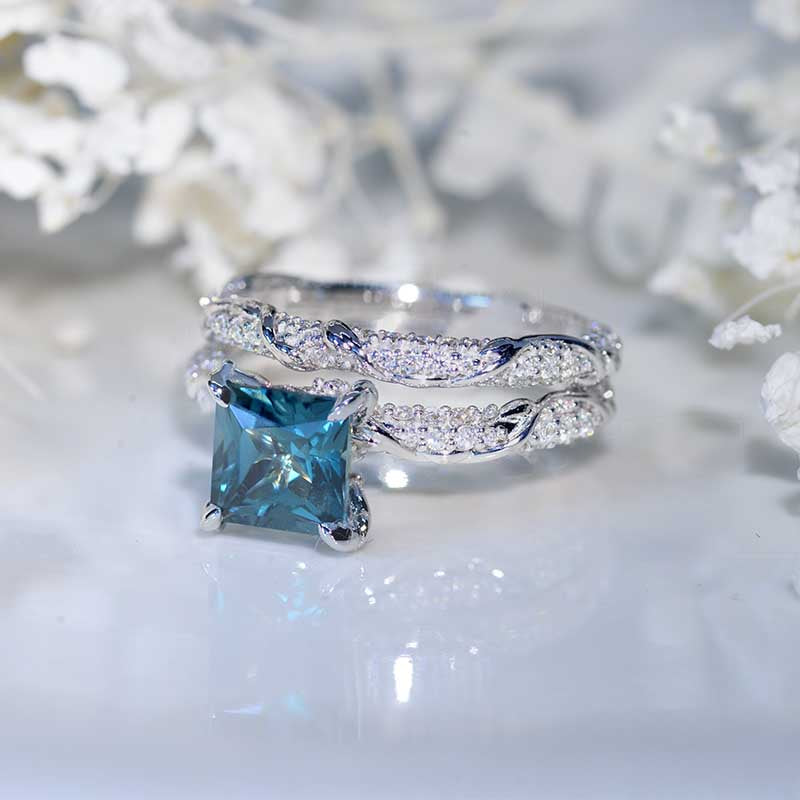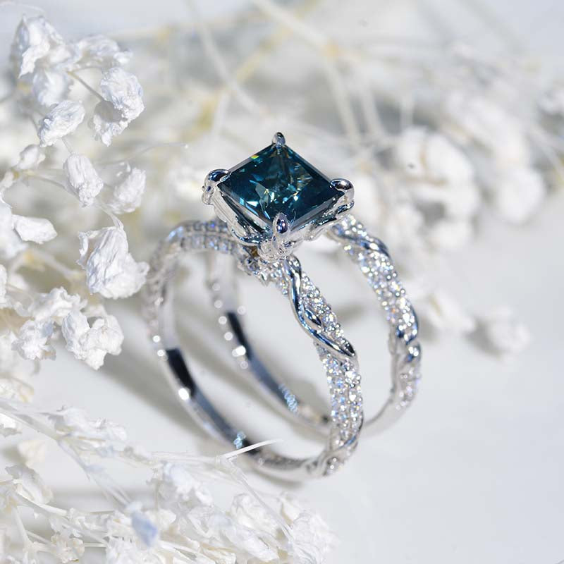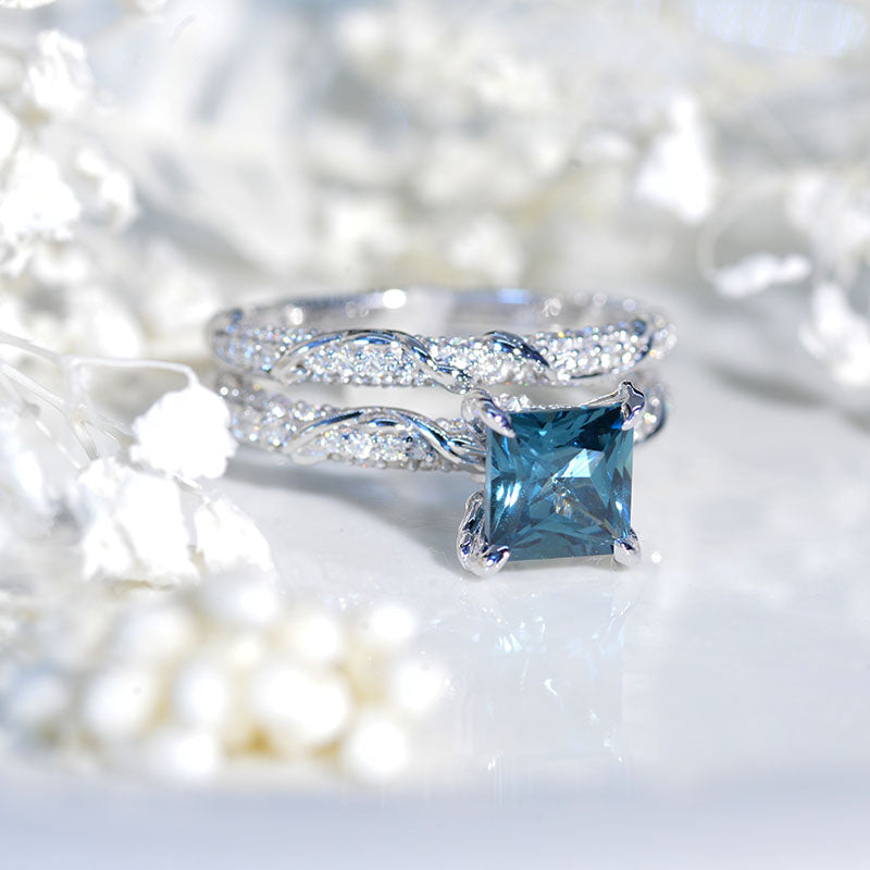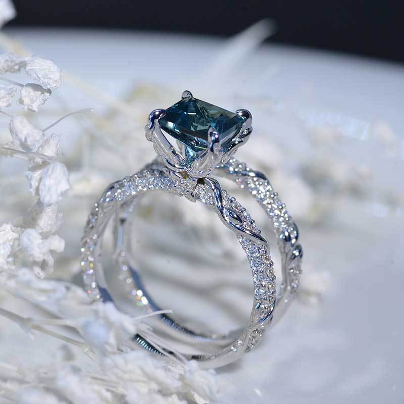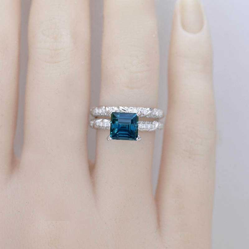 The default design option features 2 Carat 7x7mm Princess Cut Ethically Lab-Grown Teal Sapphire Center Stone, VG-Cut, Ex-Polish, VG-Symmetry in 14K White Gold Engagement Ring.