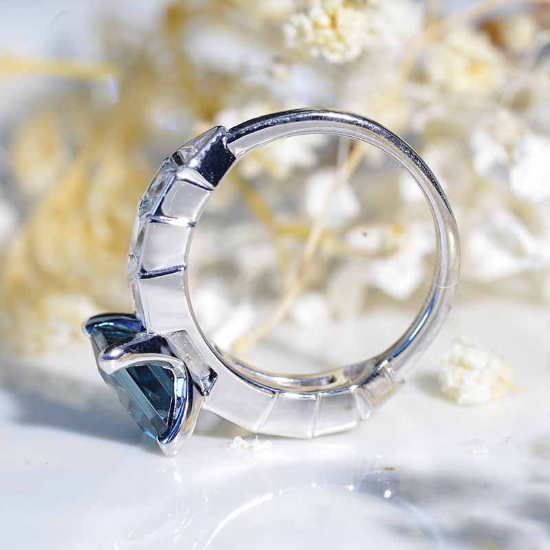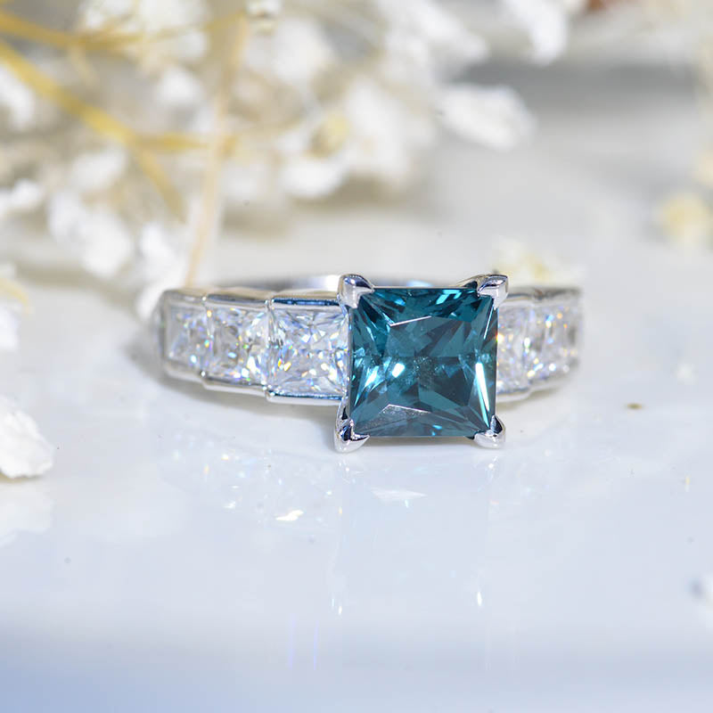 2.0 Carat Ethically Lab-Grown Teal Sapphire Center Stone Princess Cut 7x7mm, Ex-Cut, Ex-Polish, VG-Symmetry and Moissanite Accent Stones (1.5 CTW D-Colorless VVS1 clarity) with 14K White Gold.