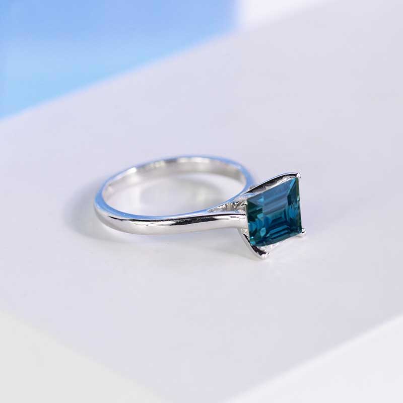 The default design option features 2 Carat-7x7mm Princess Cut Ethically Lab-Grown Teal Sapphire Center Stone, VG-Cut, Ex-Polish, VG-Symmetry