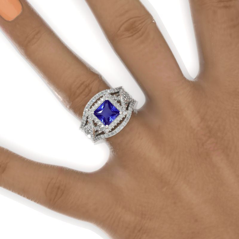 Engagement Ring : 2 Carat Natural Genuine Tanzanite Princess Cut 7x7mm VG-Cut, Ex-Polish, VG-Symmetry Center Stone with 38 Colorless 0.5 CTW Moissanite