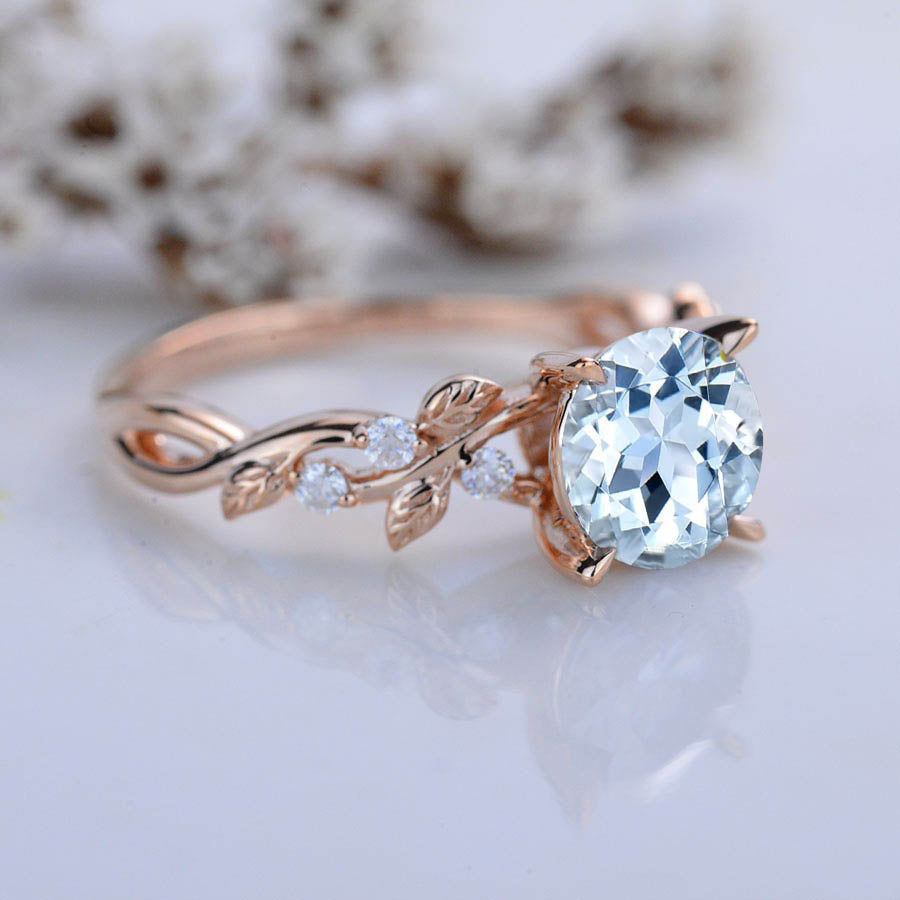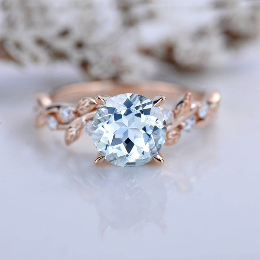 2 Carat Round Brilliant Cut Aquamarine Floral Rose Gold Engagement Rin - Giliarto
