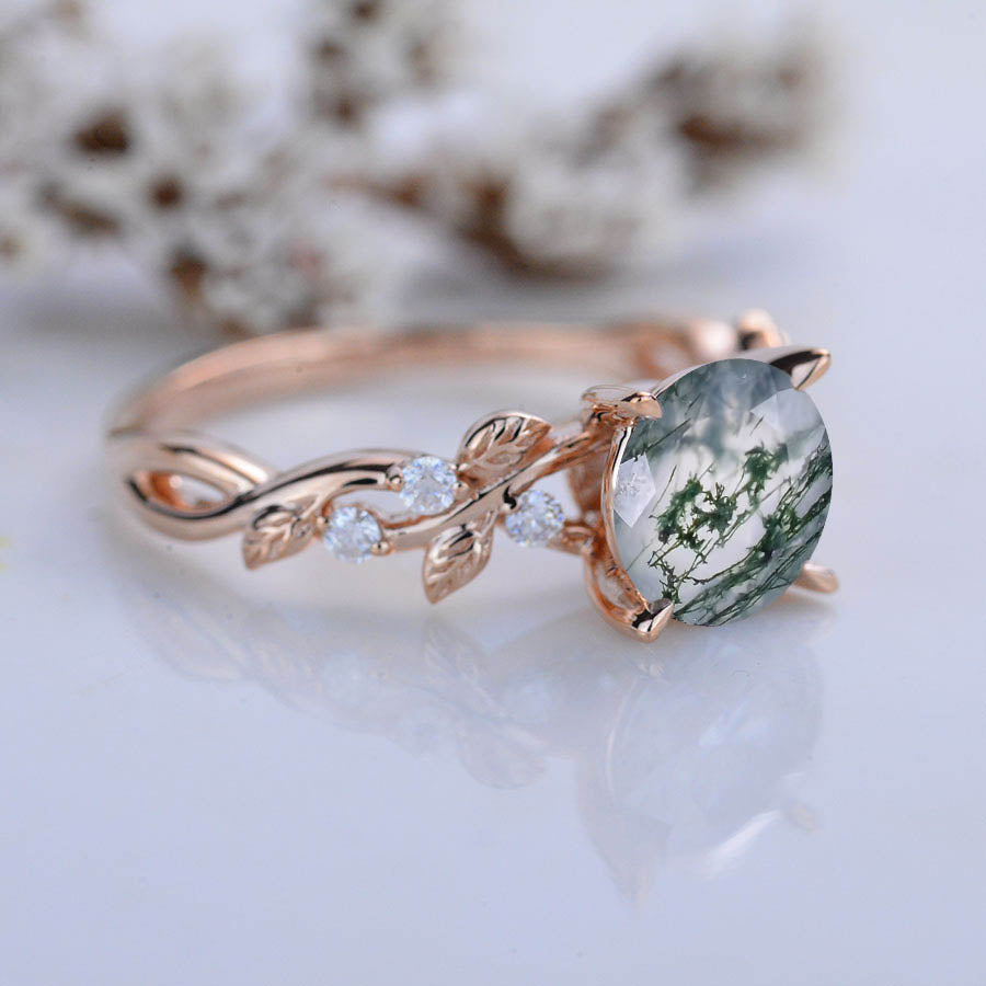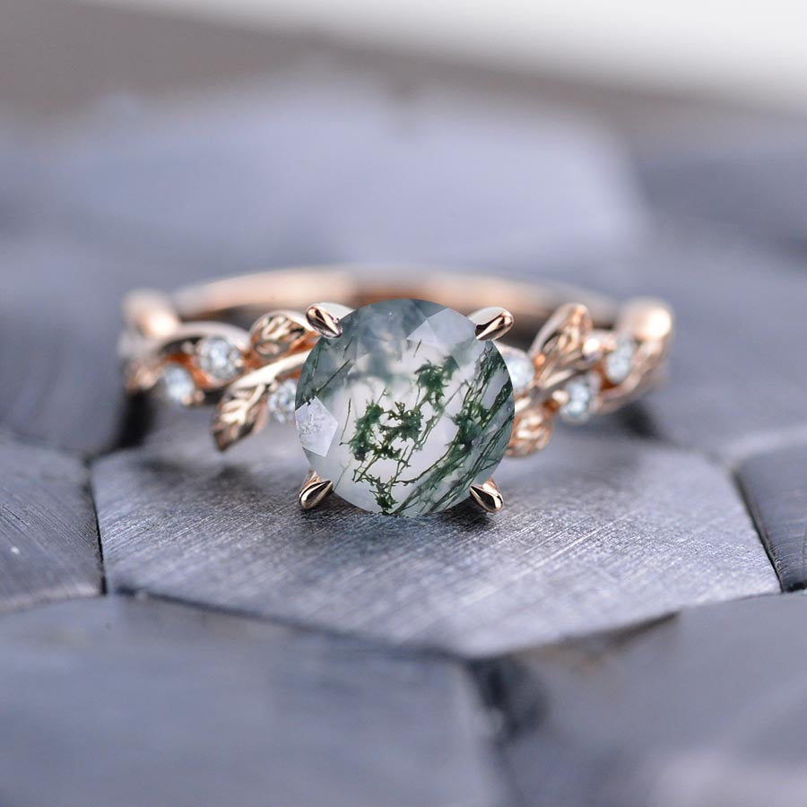 2 Carat Round Brilliant Cut Moss Agate Floral Rose Gold Engagement Rin - Giliarto