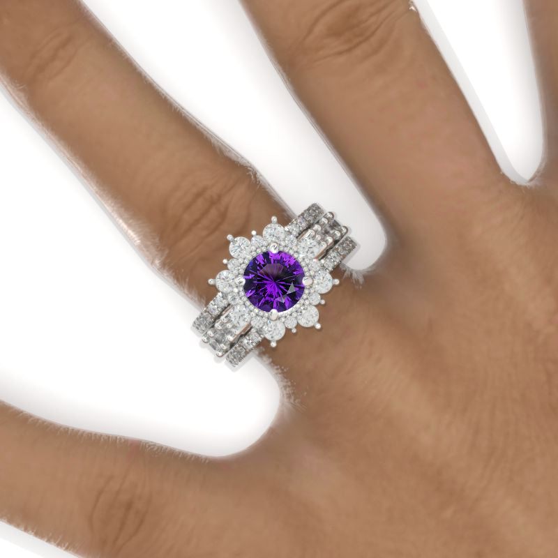 2 Carat Round Brilliant Cut Natural Amethyst Halo 14K White Gold Engagement Ring, Eternity Rings Set