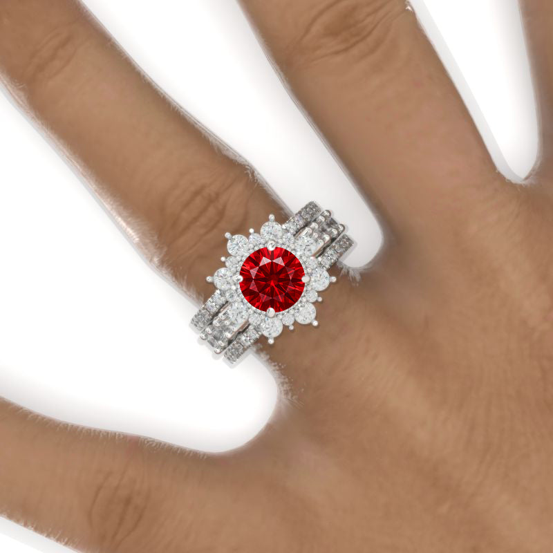 2 Carat Round Brilliant Cut Ruby Halo 14K White Gold Engagement Ring, Eternity Rings Set