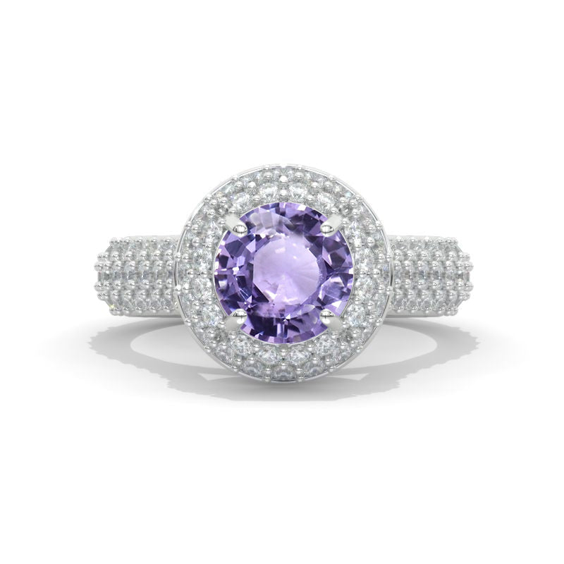 The default design option features 2 Carat Round Cut 8mm Ethically Lab-Grown Purple Sapphire Center Stone VG-Cut, Ex-Polish, VG-Symmetry with 0.8 CTW Accents