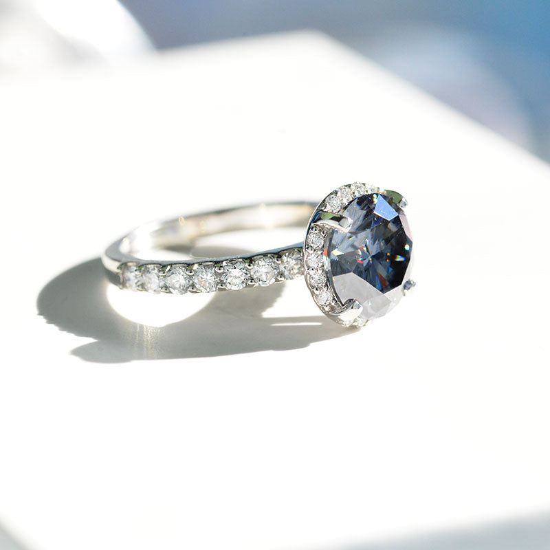 2 Carat Dark Gray - Blue Moissanite Round 8 mm VVS1 - Clarity, VG-Cut, Ex-Polish, VG-Symmetry Center Stone with 30 Colorless 0.4 CTW Moissanite (D-Colorless, VVS1clarity) Accent Stones 14K White Gold or Platinum Ring.
