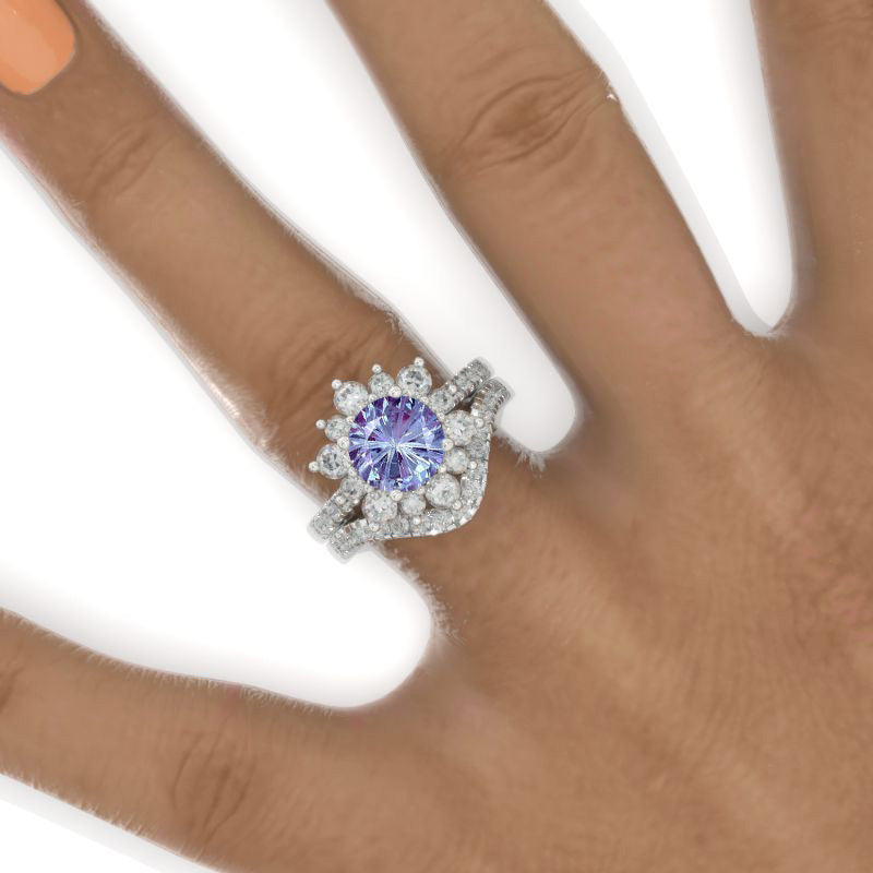 2 Carat Round Fireworks Cut Alexandrite Snowflake Halo Engagement Ring Set. Victorian 14K White Gold Ring Set)