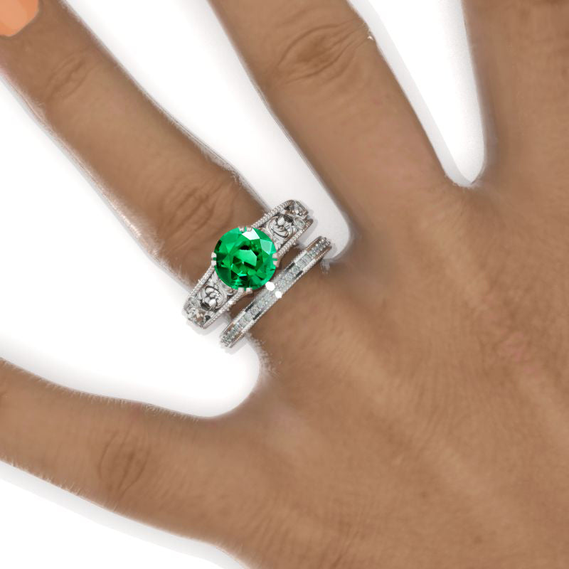 Engagement Ring : 2 CTW Carat Ethically Lab-Grown Emerald Round Shape 8mm VG-Cut, Ex-Polish, VG-Symmetry Center Stone with  Colorless 0.23 CTW Moissanite