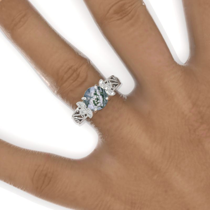 Engagement : 2Carat Genuine Moss AgateRound8mm VVS1-Clarity, VG-Cut, Ex-Polish, VG-Symmetry Center Stone Set with D-Colorless Moissanite Accent Stonesin 14K White Gold Ring.
