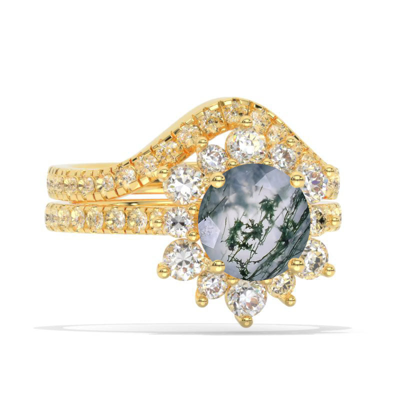 The default design option features 8mm Brilliant Cut Genuine Moss Agate Center and Accent Stones, D-Colorless, VVS1-Clarity, VG-Cut, Ex-Polish, VG-Symmetry