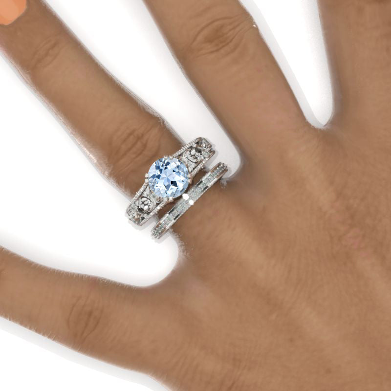 2 Carat Round Genuine Natural Aquamarine Floral Leaves Ornamental Engagement 14K White Gold Ring Eternity Ring Set