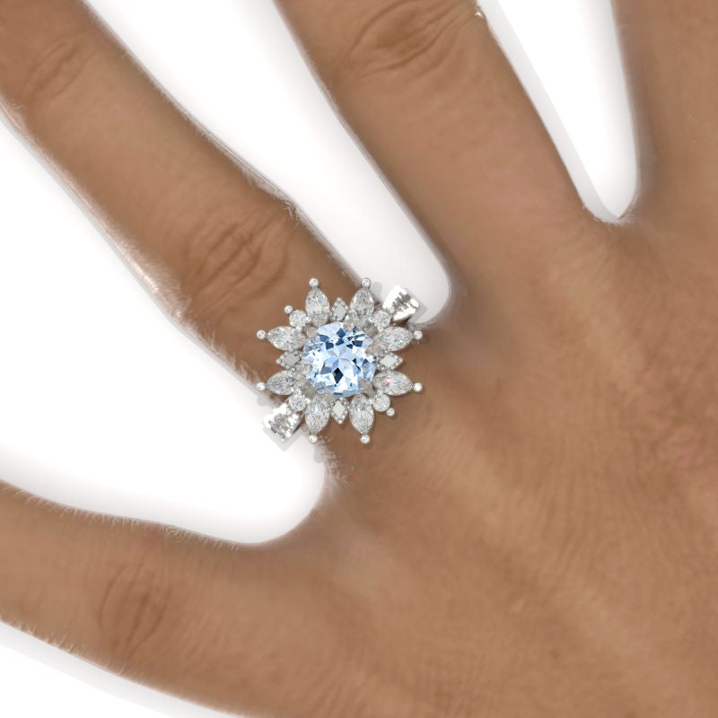 2 Carat Round Genuine Natural Aquamarine Snowflake Floral Halo Engagem - Giliarto