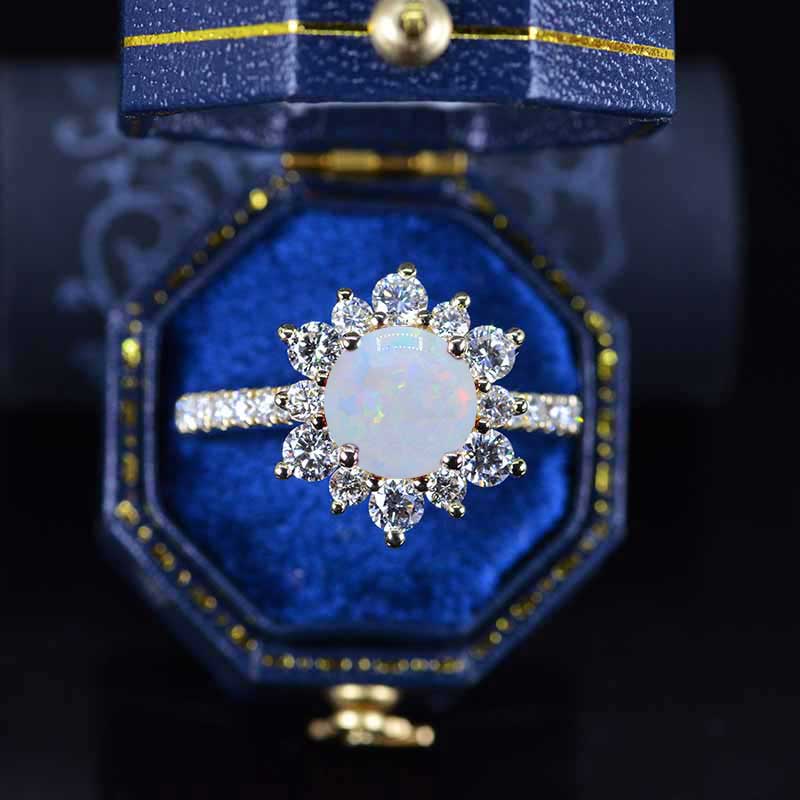 The default design option features 8mm Brilliant Cut Lab-Grown Genuine White Opal Center and Moissanite Accent Stones, D-Colorless, VVS1-Clarity, VG-Cut, Ex-Polish, VG-Symmetry