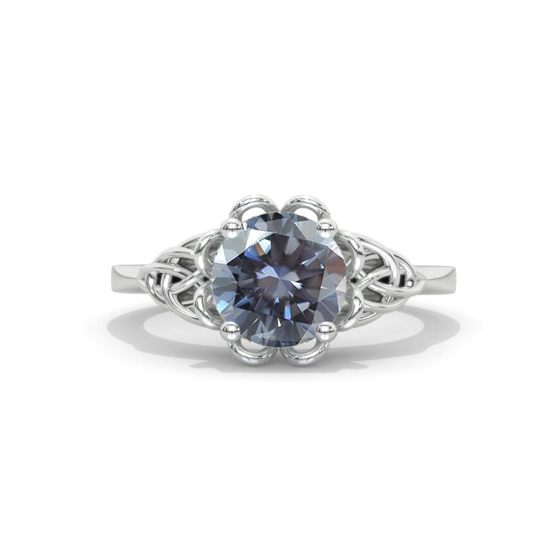 8m Round Cut Gray Moissanite VVS1-Clarity, VG-Cut, Ex-Polish, VG-Symmetry Center Stone in 14K White Gold Ring.Â