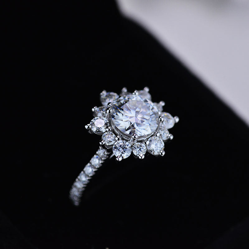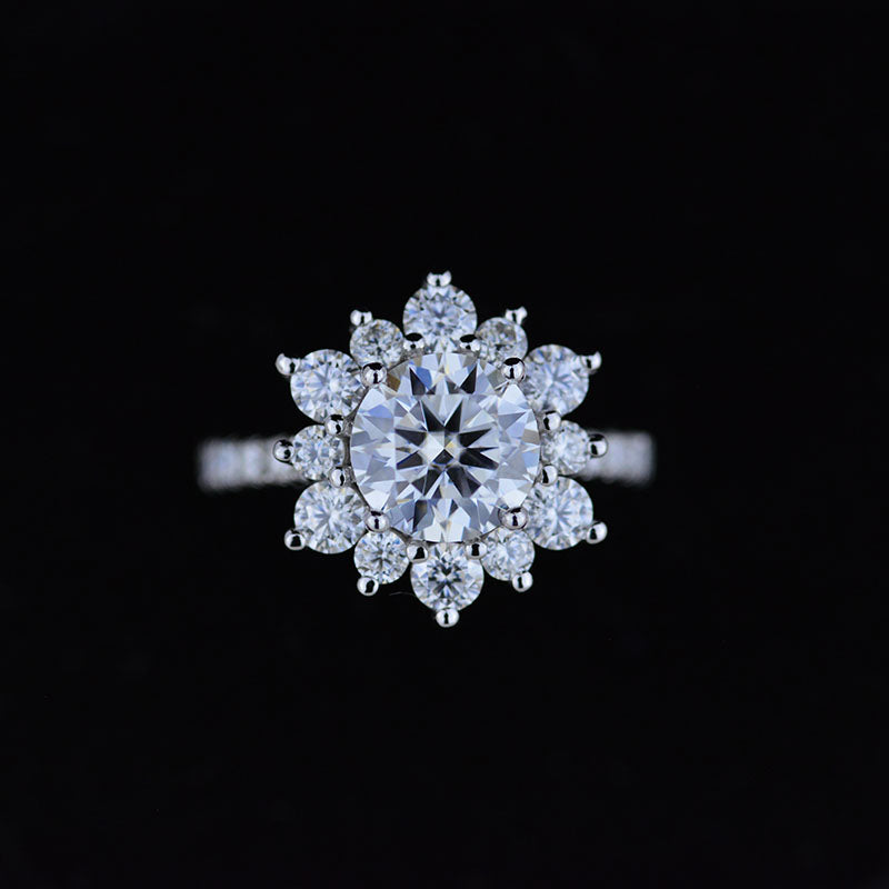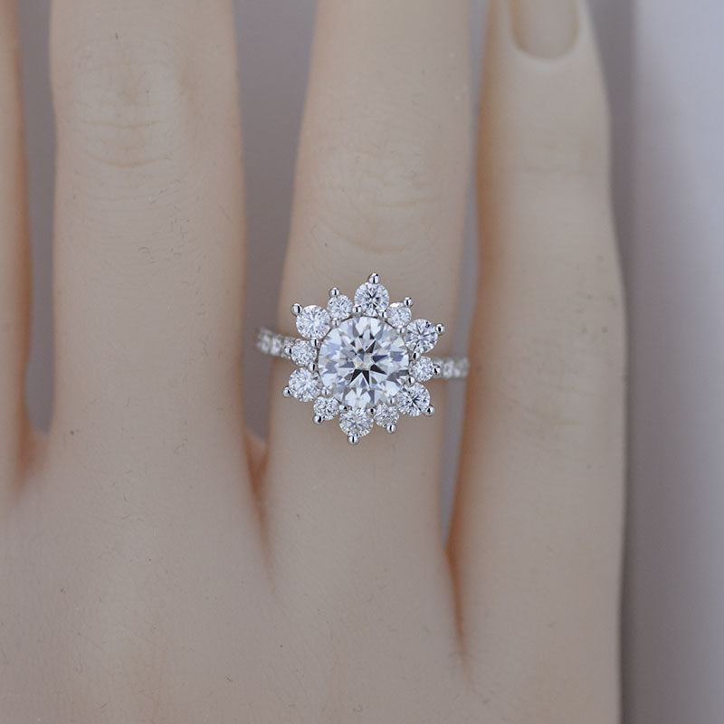 2 Carat Round Lab Diamonds Snowflake Halo Engagement Ring. Victorian 14K White Gold Ring