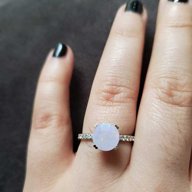 The default design option features 8mm Round Cut Natural White Opal Stones