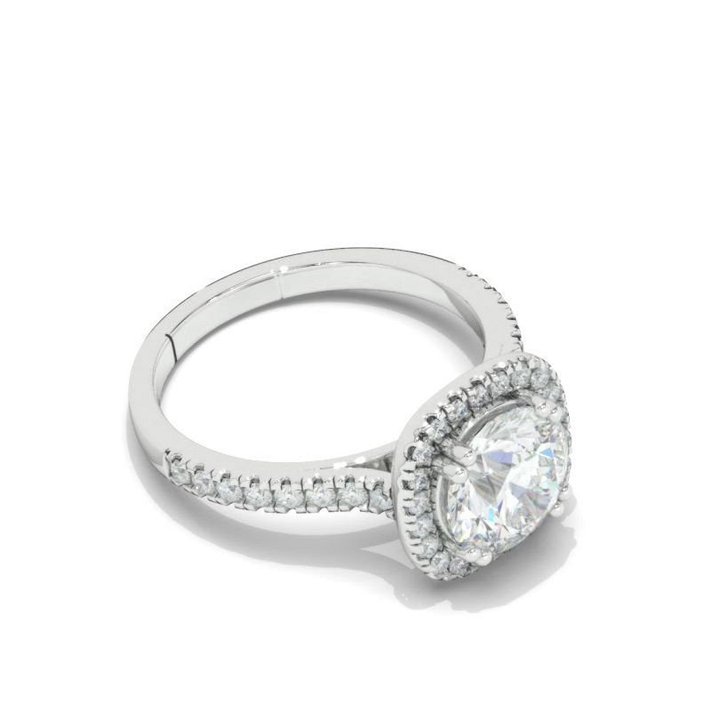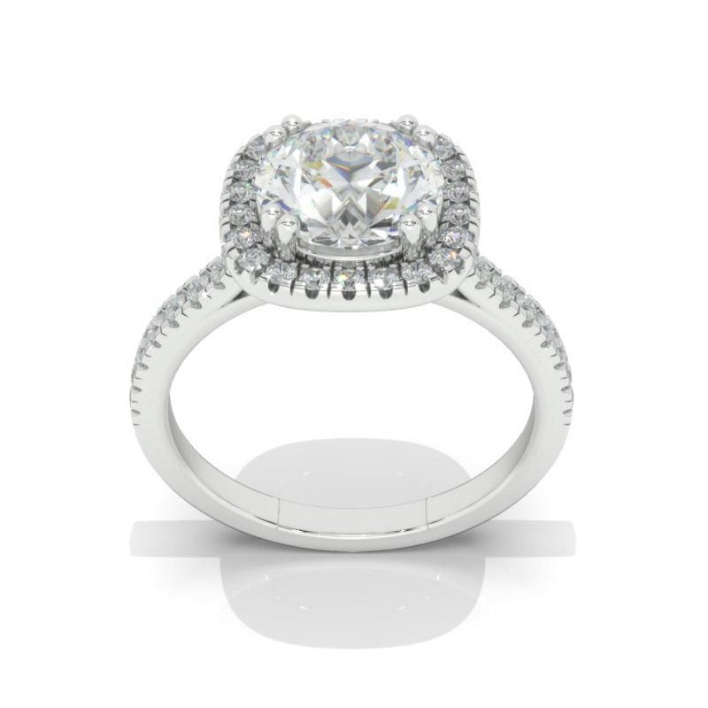 The default design option features 8mm Brilliant Cut Moissanite Stone, D-Colorless, VVS1-Clarity, VG-Cut, Ex-Polish, VG-Symmetry, Set with Colorless Moissanite Accent stones in 14K White Gold Engagement Ring.Â