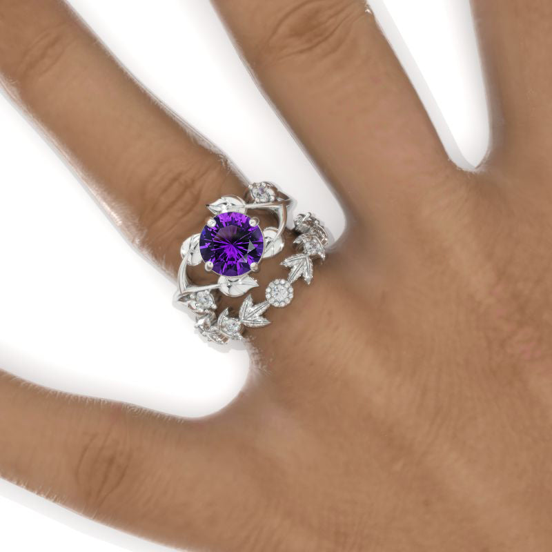 EngagementRing: 2Carat Genuine Natural Amethyst- AAAA GradeRound8mm VG-Cut, Ex-Polish, VG-Symmetry Center Stone set with D- Colorless Moissanite Accent Stones in 14K White Gold Ring.