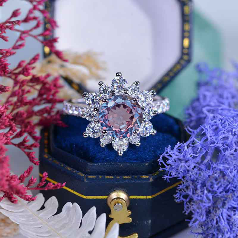 2 Carat Round Portuguese Cut Alexandrite Snowflake Halo Engagement Rin - Giliarto