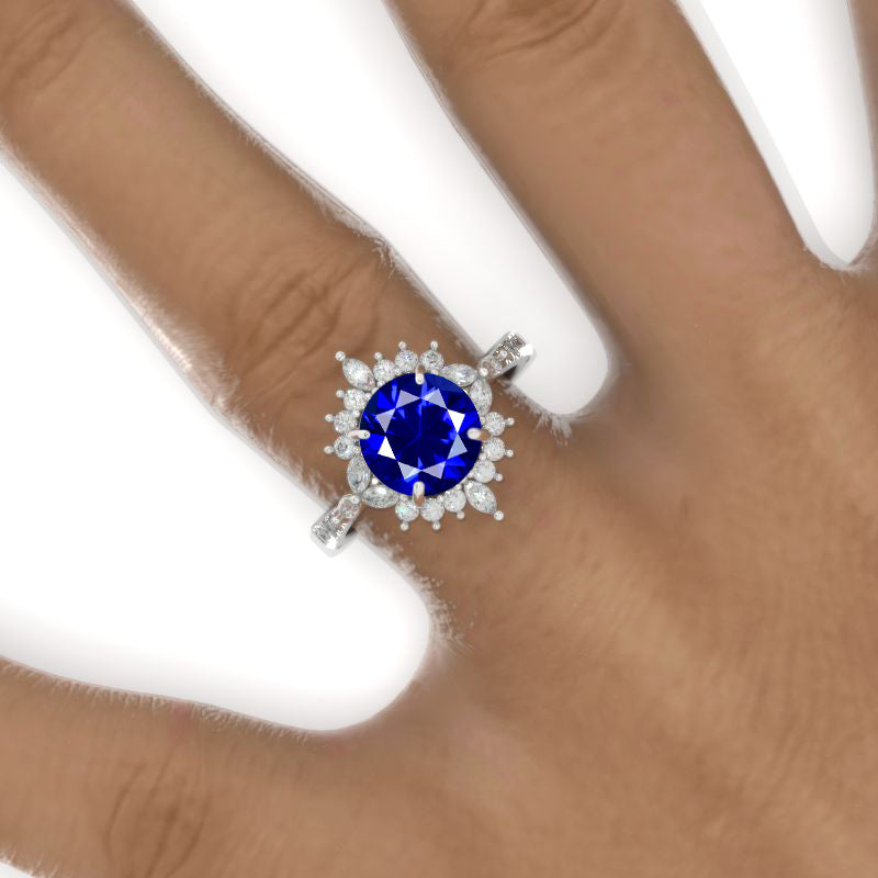 2 Carat Round Royal Blue Sapphire Floral Halo Shank Engagement Ring - Giliarto