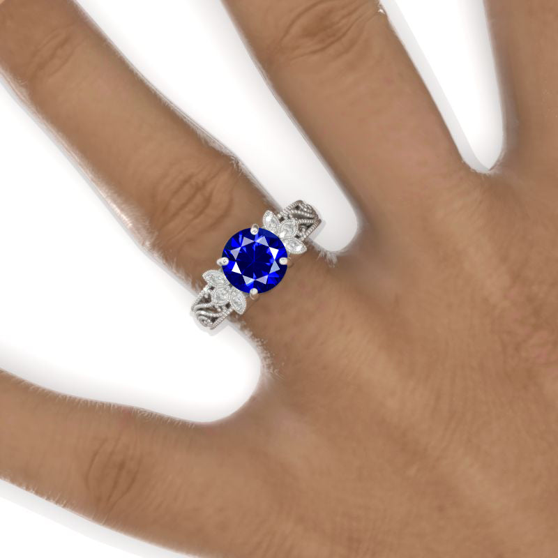 2 Carat Round Royal Blue Sapphire Floral Lace Shank Engagement Ring - Giliarto