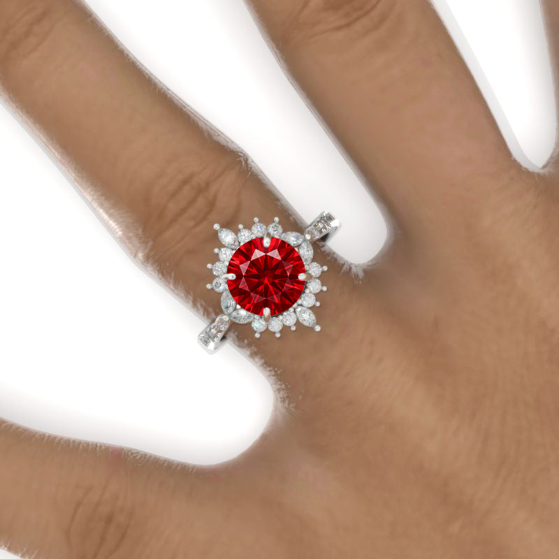 2 Carat Round Ruby Floral Halo Shank Engagement Ring - Giliarto
