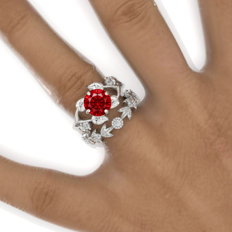 2 Carat Round Ruby Floral Twig Engagement Ring, Eternity Ring Set - Giliarto