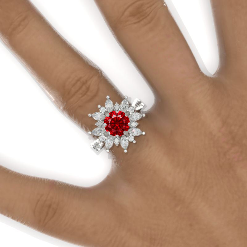 2 Carat Round Ruby Snowflake Floral Halo Engagement Ring - Giliarto