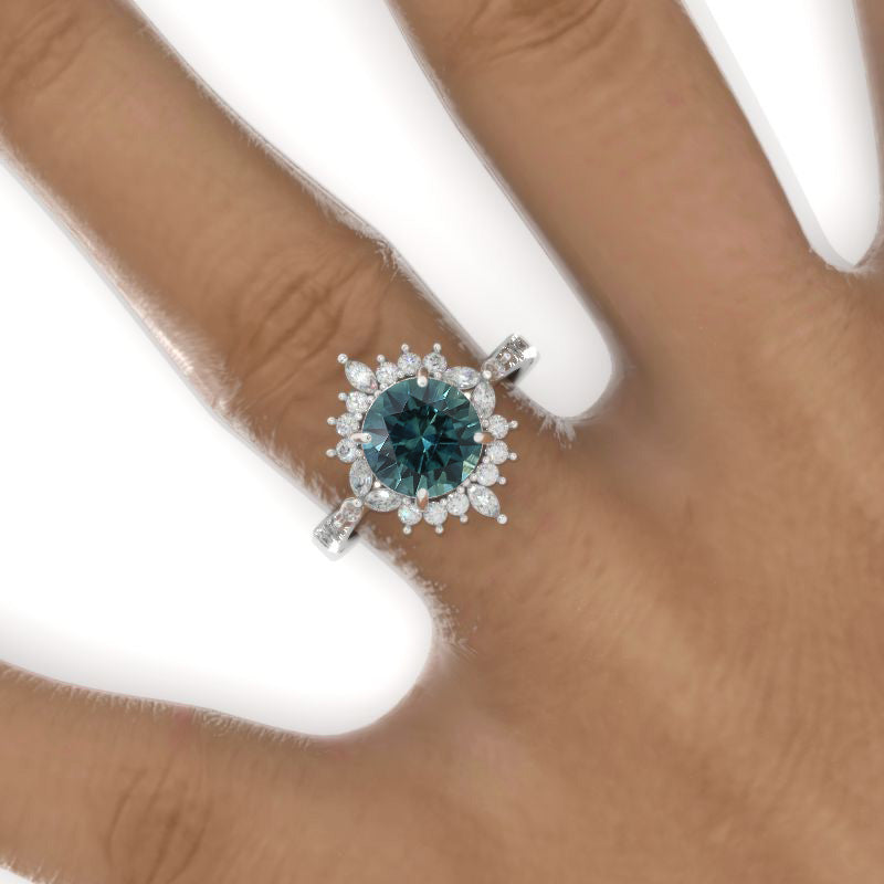 2 Carat Round Teal Sapphire Floral Halo Shank Engagement Ring - Giliarto
