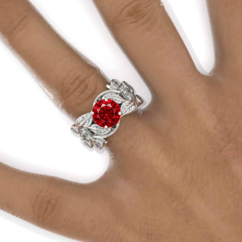 2 Carat Ruby Ornamental Floral Twig White Gold Engagement Ring - Giliarto