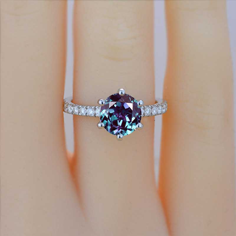 The default design option features 8mm Giliarto Ethically Lab-Grown Alexandrite Center Stone and Moissanite Accents Stones D-Colorless, VVS1-Clarity, VG-Cut, Ex-Polish, VG-Symmetry