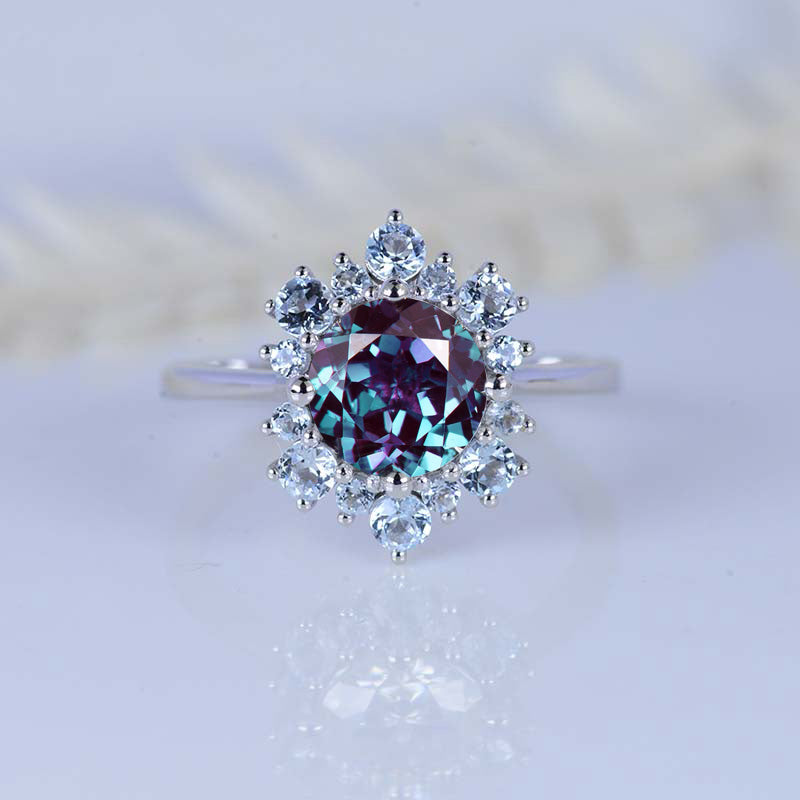 2 Carat Snowflake Alexandrite with Aquamarine Halo 14K White Gold Ring - Giliarto
