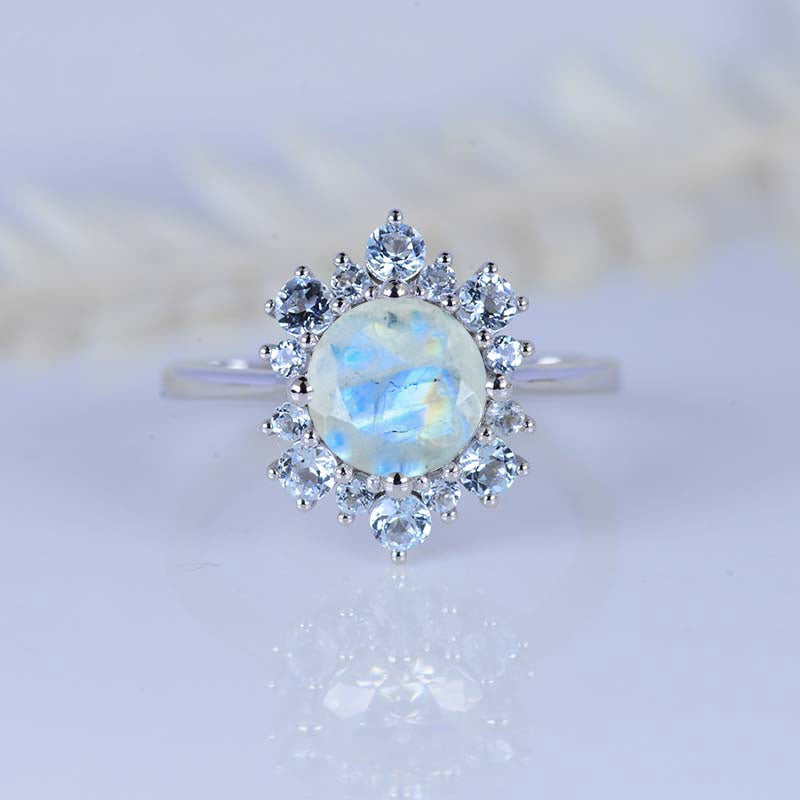 2 Carat Snowflake Genuine Moonstone with Aquamarine Halo 14K White Gold Ring