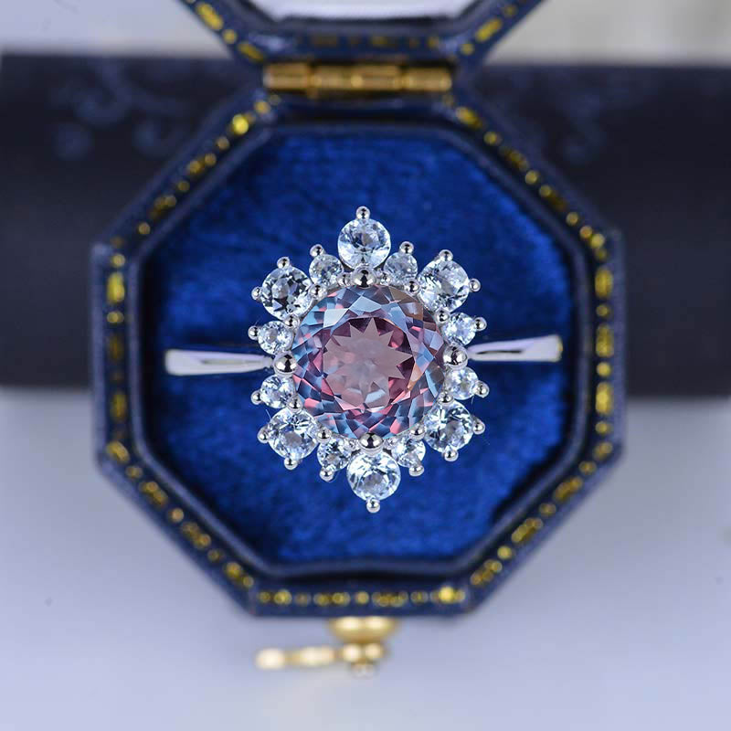 2 Carat Snowflake Portuguese Cut Alexandrite with Aquamarine Halo 14K White Gold Ring